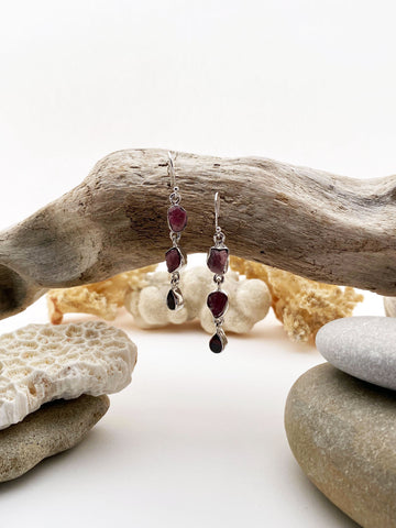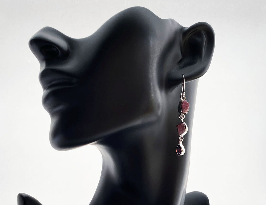 These drop earrings are handcrafted from 925% Sterling Silver and feature semi-precious rough Ruby stones and one faceted Garnet stone. With a minimal and elegant design, these earrings are perfect for any special event.